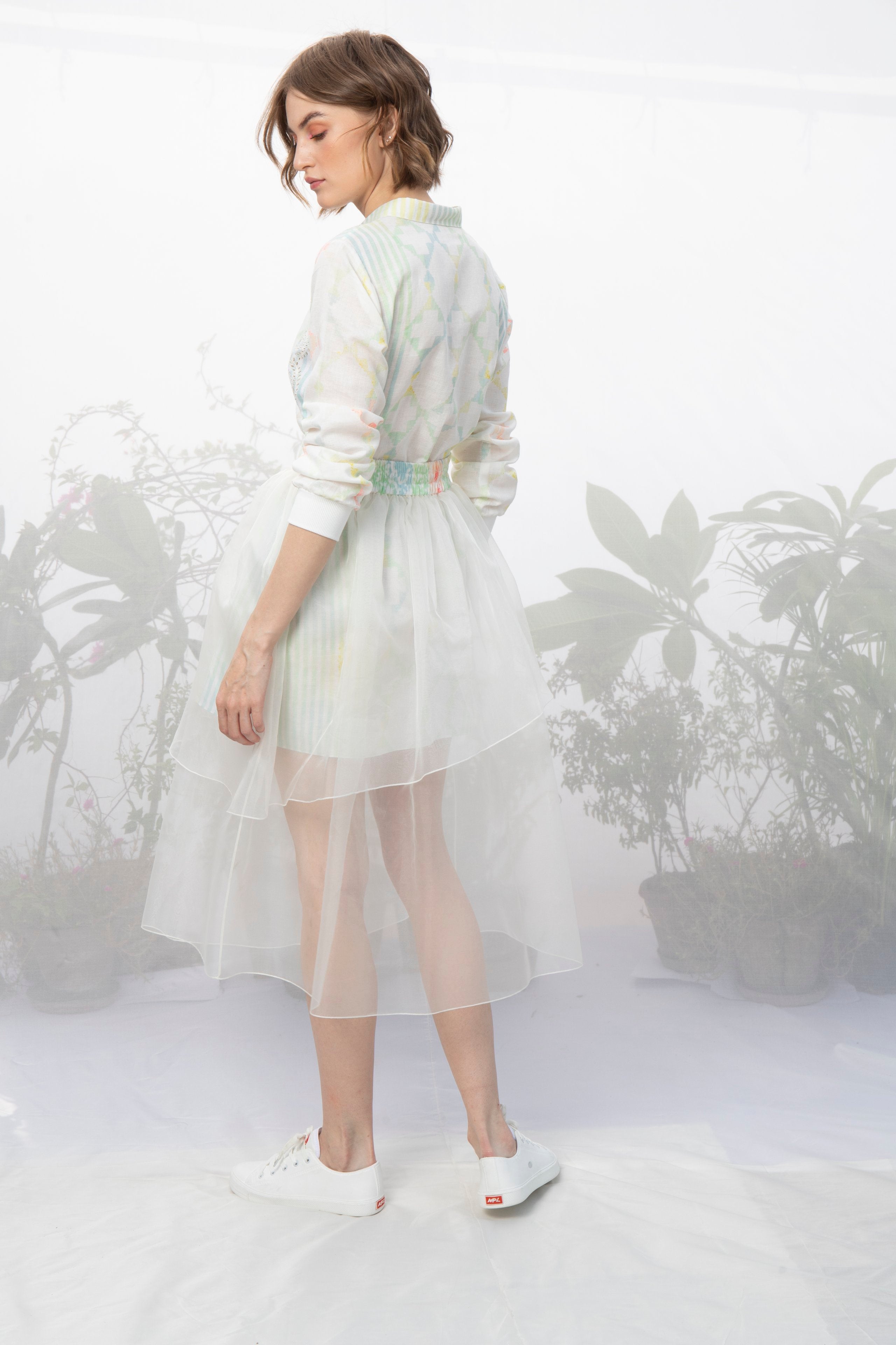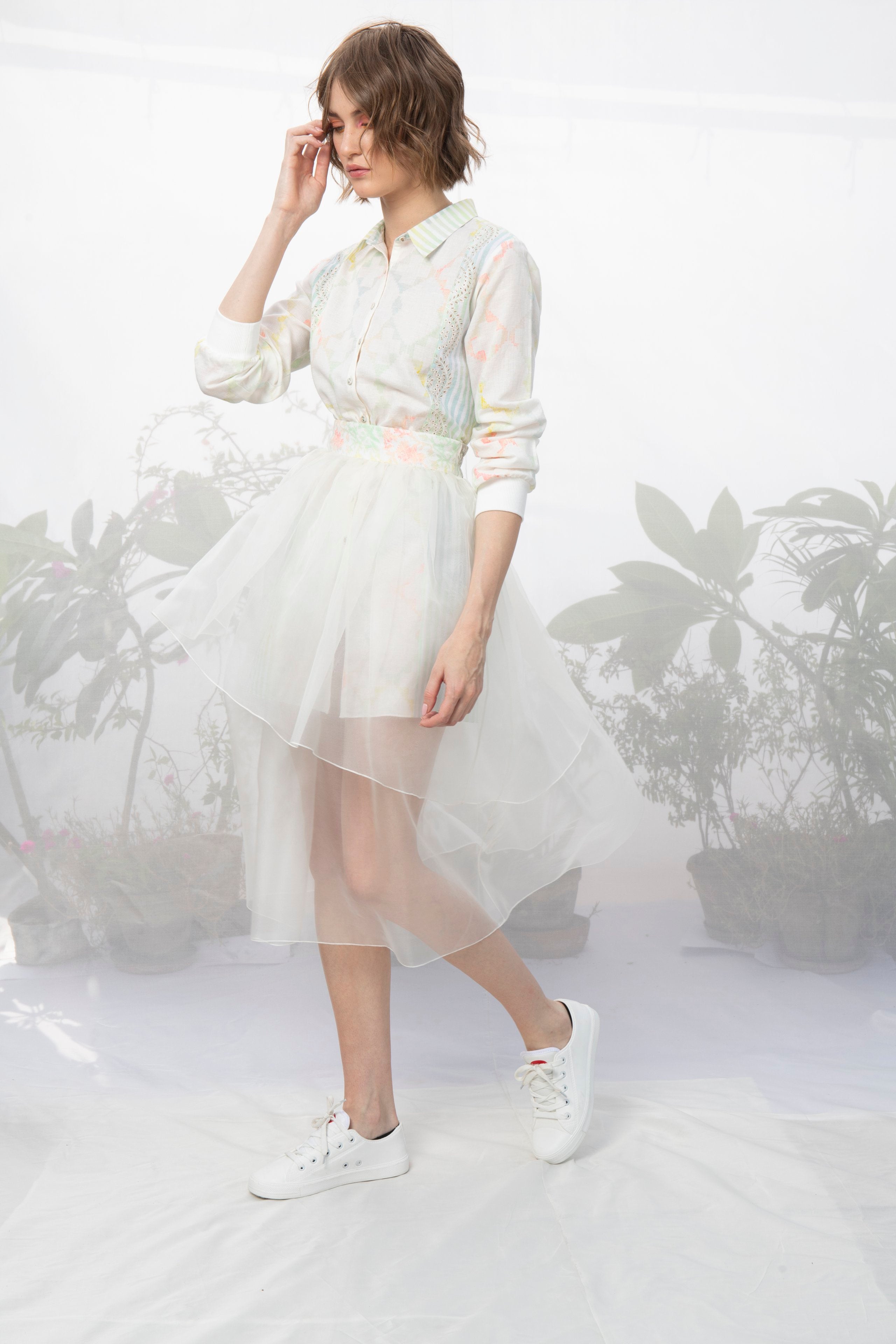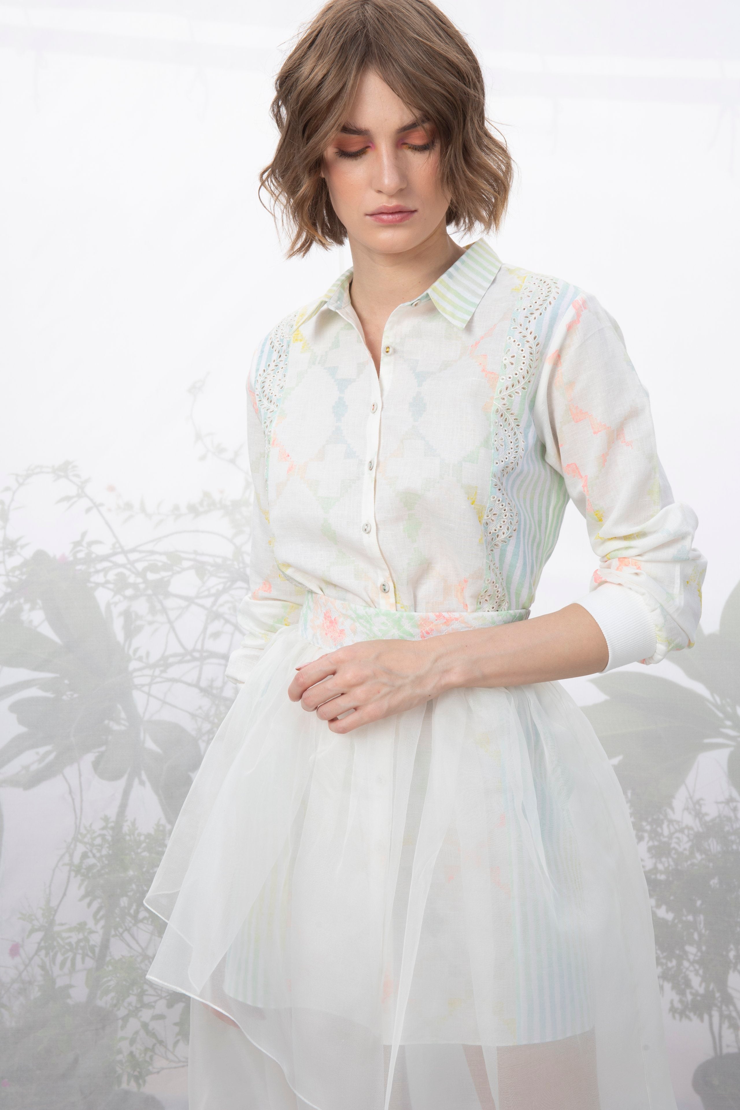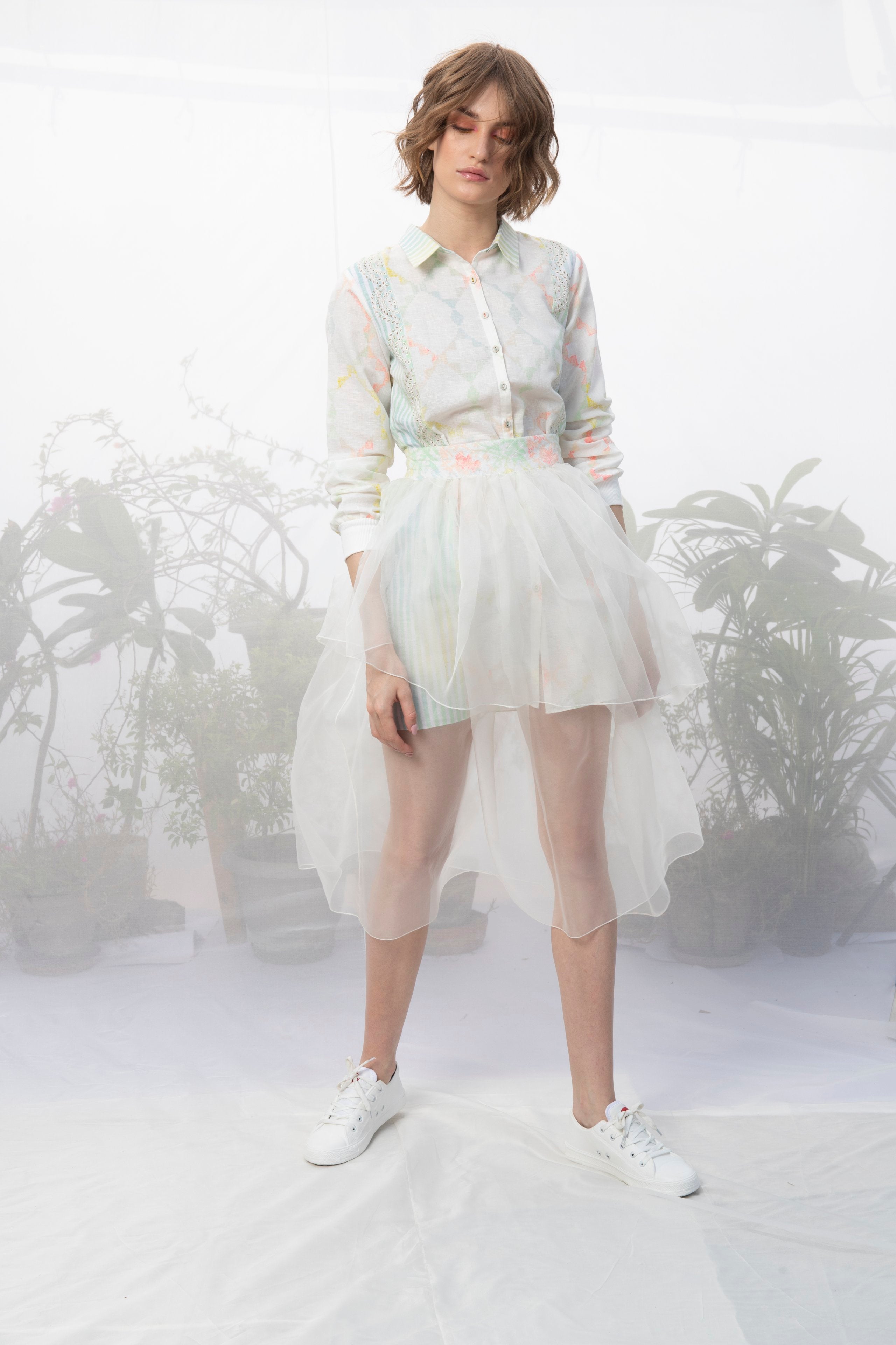 Featuring an ivory hand block printed shirt with shiffli embroidery teamed with layered skirt in linen and organza.