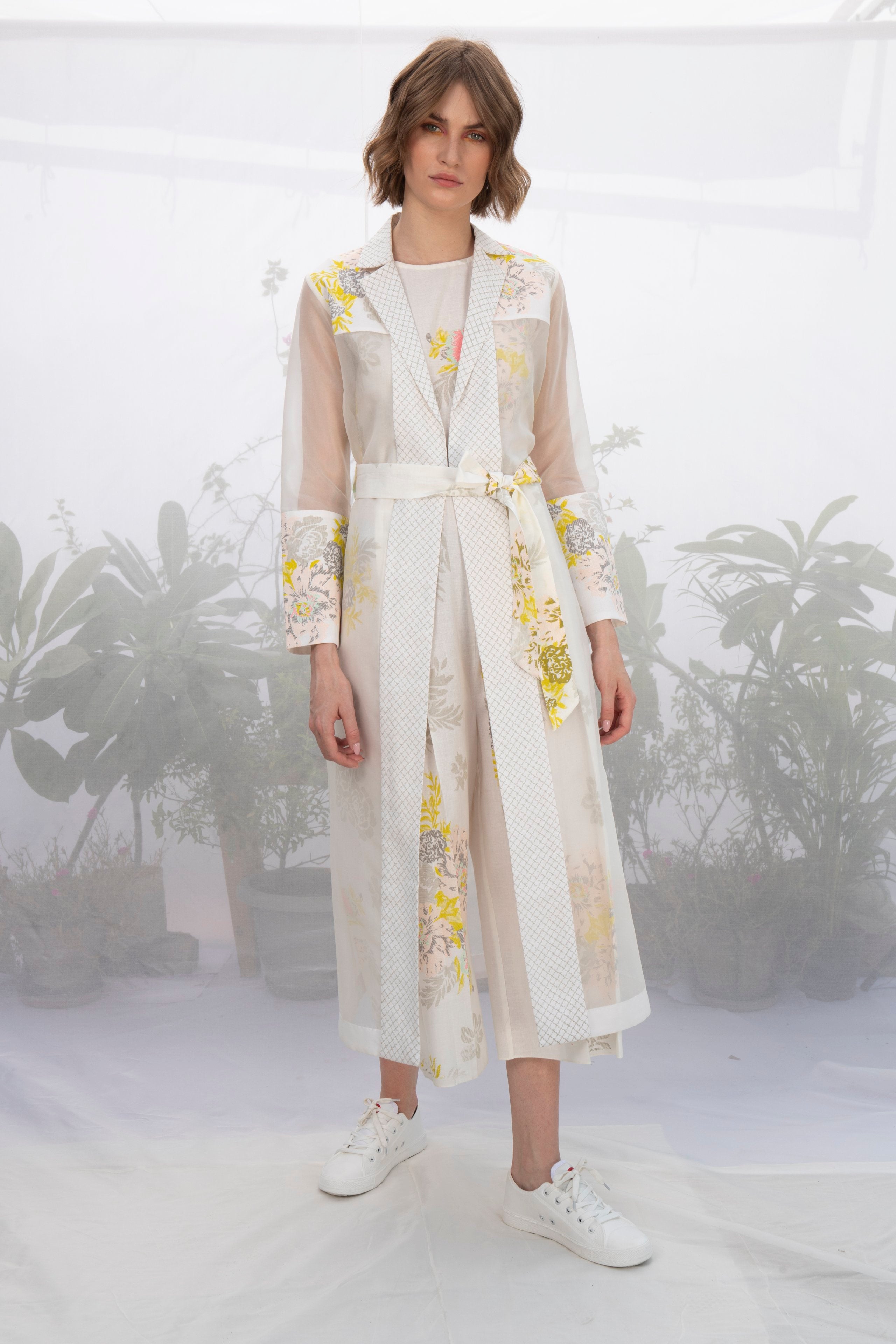 Featuring an ivory Roses print jumpsuit with jacket in linen and organza