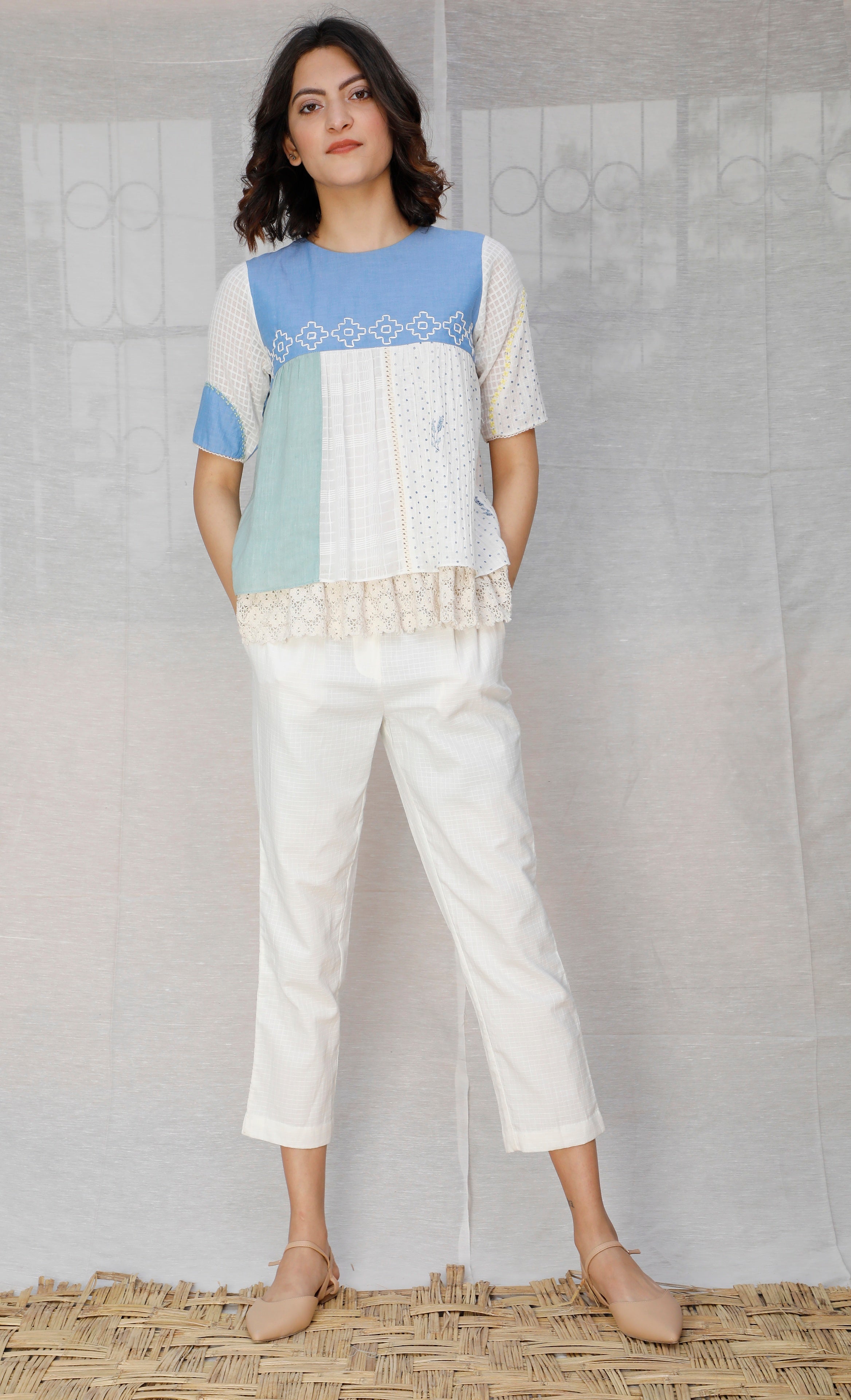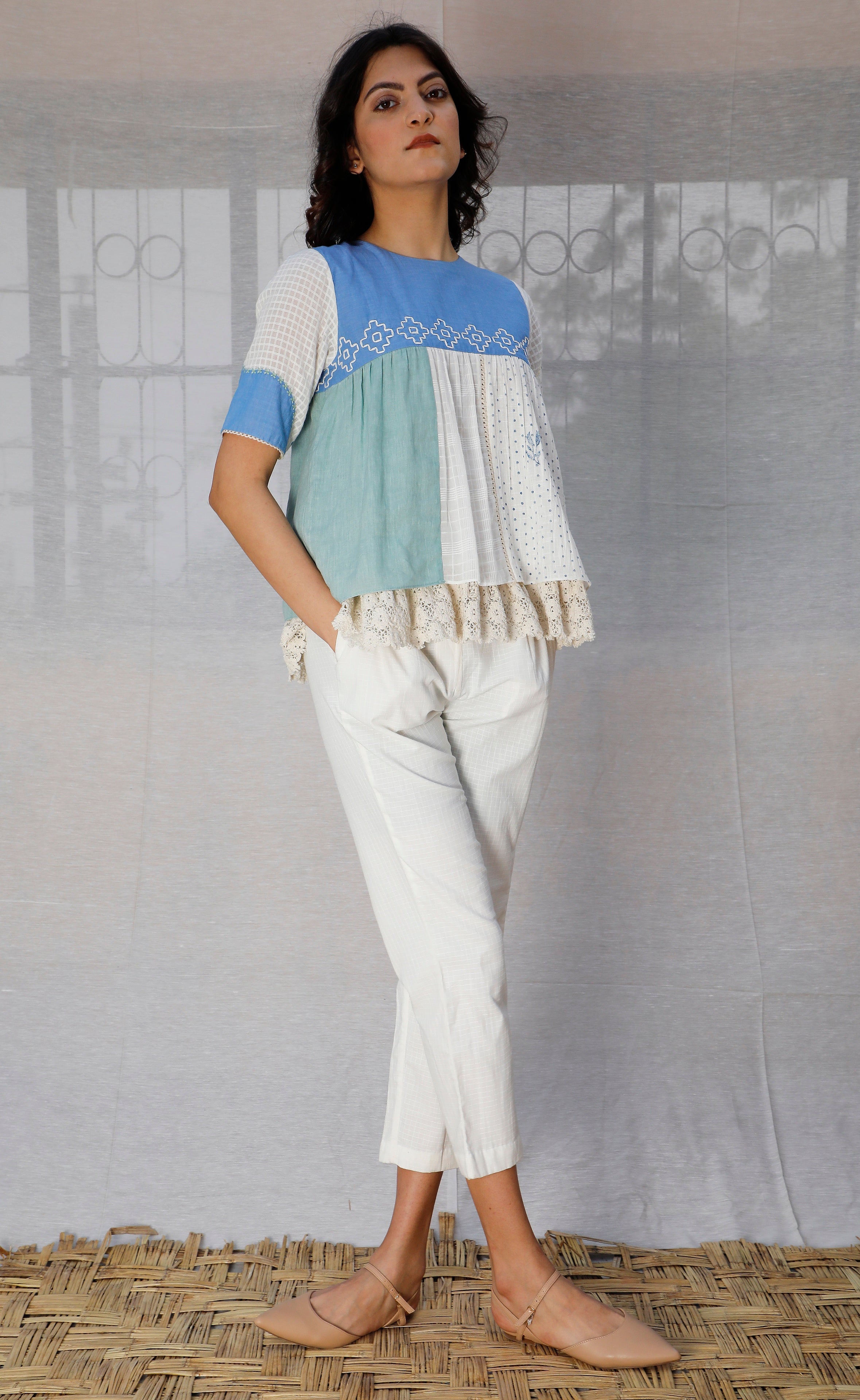 Multi Panelled Top In Cotton And Linen With Thread Embroidery, Applique And Lace Details.