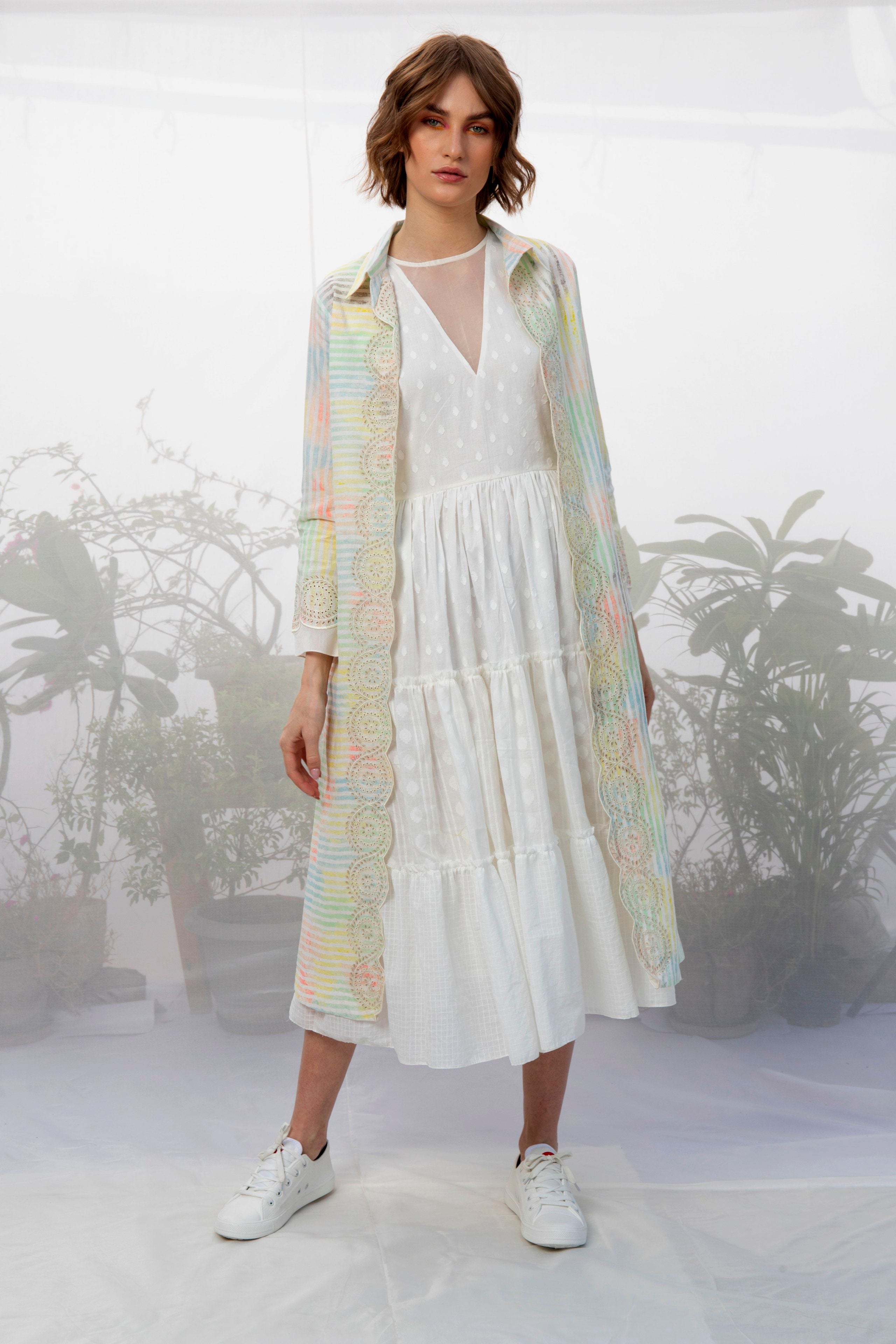 Featuring a ivory multi stripes hand block printed jacket with dress in cotton and linen
